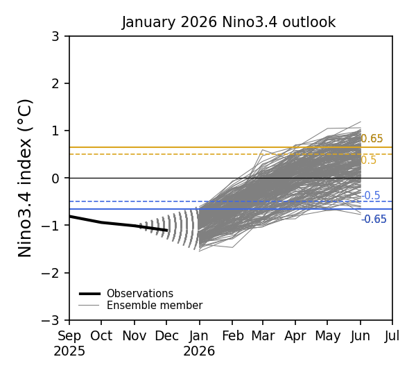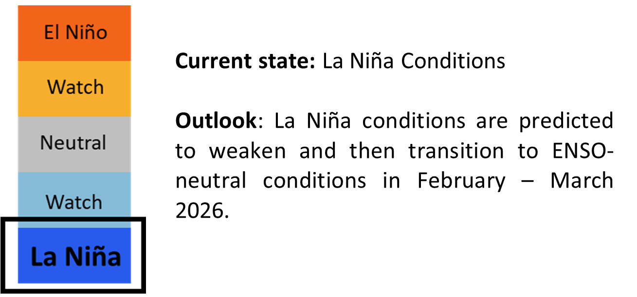 La Niña conditions are predicted to weaken in February 2026, with models predicting a transition to ENSO-neutral conditions in February – March 2026.