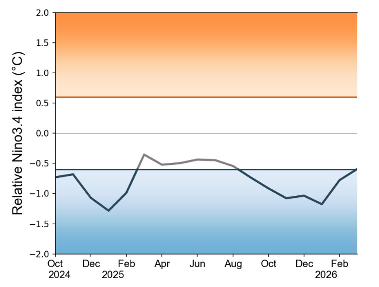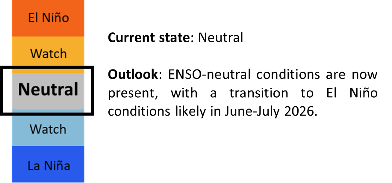 La Niña conditions are predicted to weaken in February 2026 and transition to ENSO-neutral conditions in March 2026. Models predict the ENSO-neutral conditions to persist at least until May 2026, with either ENSO-neutral continuing or El Niño conditions developing in June-July 2026.