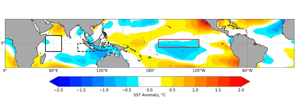 The sea surface temperatures (SSTs) over the tropical Pacific in January 2026 were below average in the central and eastern portions of the region and above average in the west, indicative of La Niña conditions (Figure 1). The coolest (negative) anomalies were in the eastern tropical Pacific including the Nino3.4 region (red box). Across the Indian Ocean, the equatorial region was near-average in the eastern parts of the region (including the dashed black box). The equatorial region in western part (including the sold black box) was likely also near-average, with small anomalies whose sign differs in different datasets (not shown). This dipole pattern indicates the IOD remained neutral in January 2026.