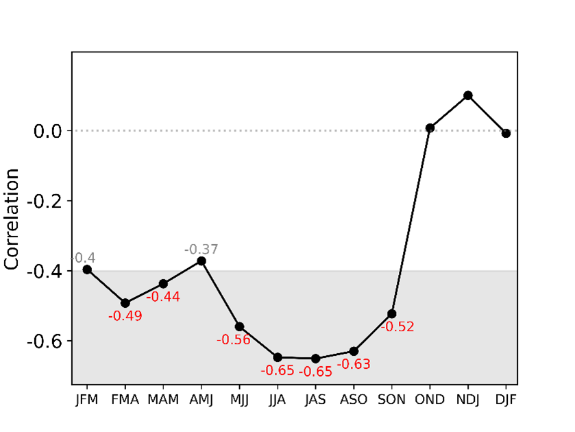 Figure 5: Correlation between total seasonal rainfall (averaged over 5 Singapore stations) and seasonal Nino3.4 index from 1961-2017 centred on the month indicated (e.g., for June’s value it corresponds to season May-June-July). The statistically significant correlations at the 95% level are underlined, at 99% level in red.