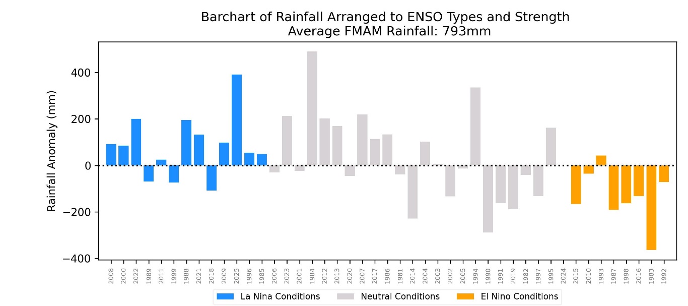 Figure 6: Singapore rainfall anomalies for February – May (as a percentage of departure from long-term rainfall average) arranged in the order from strong La Niña (left) to strong El Niño (right). Brown bars denote El Niño years’ anomalies, blue bars denote La Niña years’ anomalies, and grey bars denote ENSO neutral years’ anomalies.