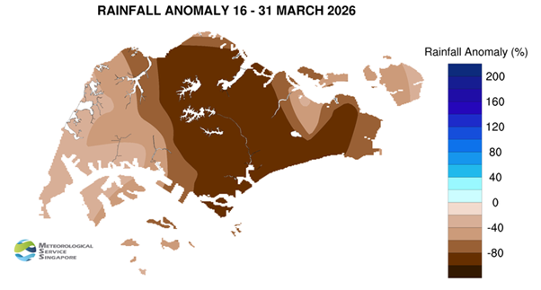 6 There were several fair days in the second fortnight of March 2026. Short-duration thundery showers fell over parts of the island in the afternoon on a few days. On 17 March 2026 and18 March 2026, localized thundery showers affected the southern and western part of Singapore in the afternoon. The daily total rainfall of 58.4mm recorded at Tuas South on 17 March 2026 and at Lim Chu Kang on 18 March 2026 was the highest rainfall recorded for the second fortnight of March 2026.